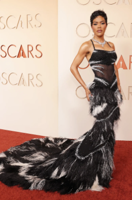 Starting on a positive note, Teyana Taylor never disappoints on the red carpet and this is no exception. She’s wearing a black and white feathered Chanel dress in Chanel’s signature colors. I love how there is a mix of feathers and bedazzled embellishments which make the dress more texturally interesting. Another feature I like is the sheer part of the dress with its embellishments resembling feathers. Lastly, her Tiffany & Co. necklace is a beautiful choice that pairs so well with the gorgeous dress.